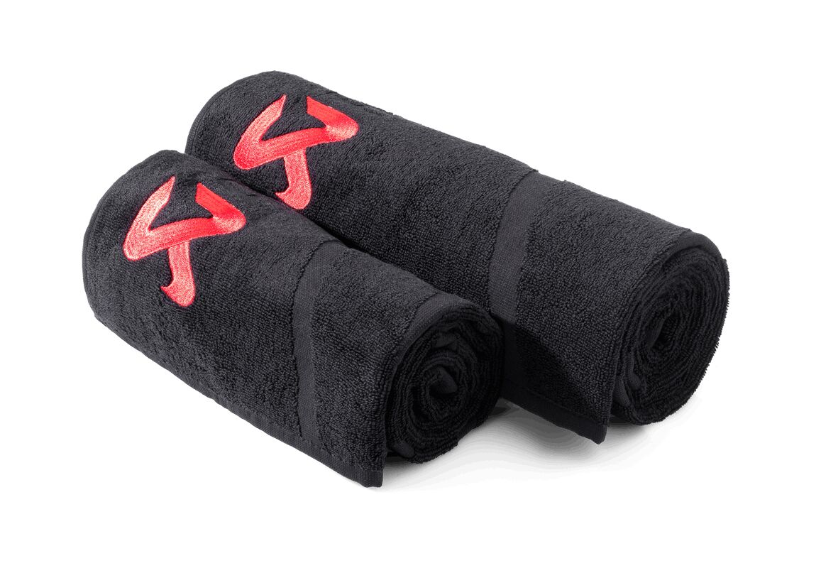 Pair of high-quality cotton towels in full black with an embroidered red Akrapovic logo.